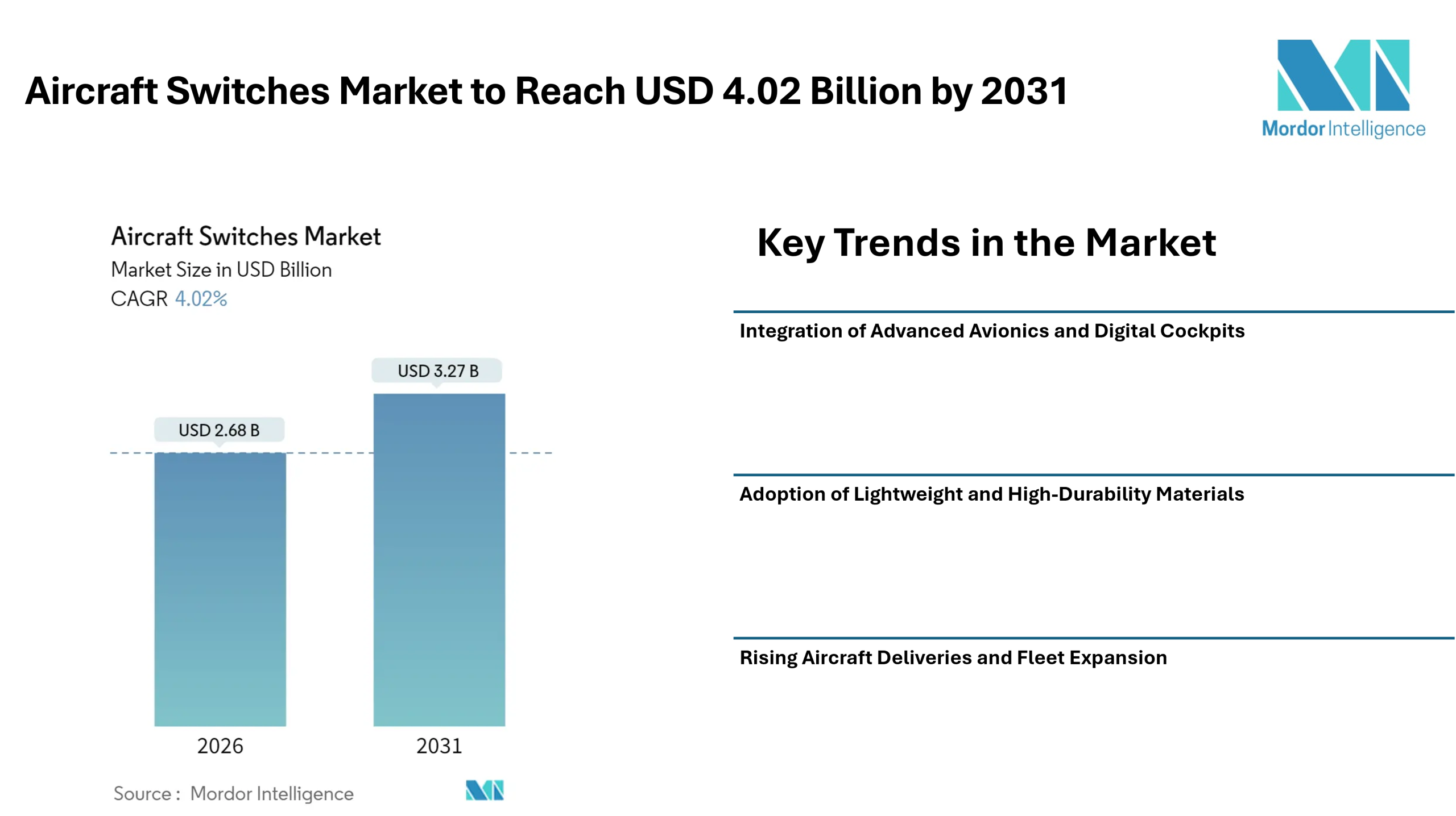 The global aircraft switches market was valued at USD 2.68 billion in 2026 and is projected to reach USD 3.27 billion by 2031, expanding at a compound annual growth rate (CAGR) of 4.02% during the forecast period. This steady expansion reflects the rising adoption of next-generation avionics, increased aircraft manufacturing activity, and the aviation industry’s continued emphasis on safety, reliability, and cockpit ergonomics.