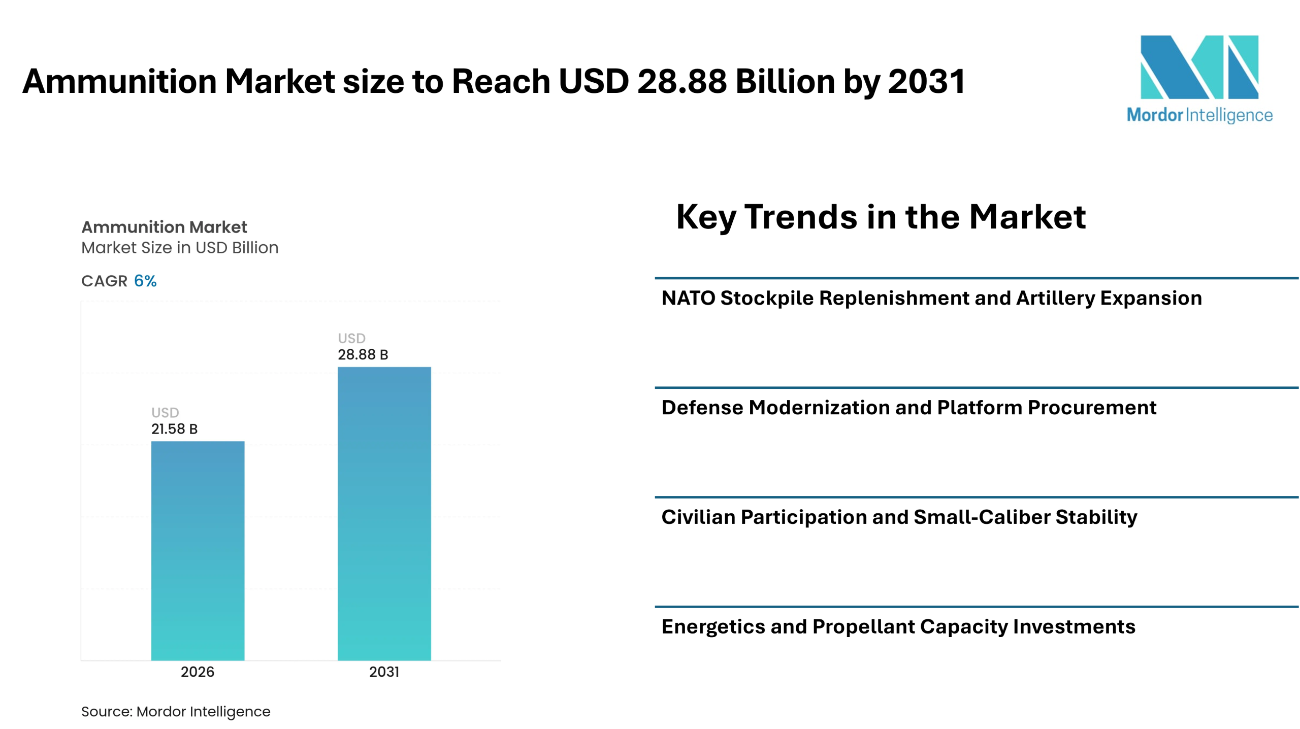 According to Mordor Intelligence, the ammunition market size is expected to grow from USD 21.58 billion in 2026 and is forecasted to reach USD 28.88 billion by 2031, registering a CAGR of 6.00% during the forecast period. Sustained defense procurement programs, artillery stockpile rebuilding initiatives, and modernization plans across allied nations are supporting ammunition market growth.