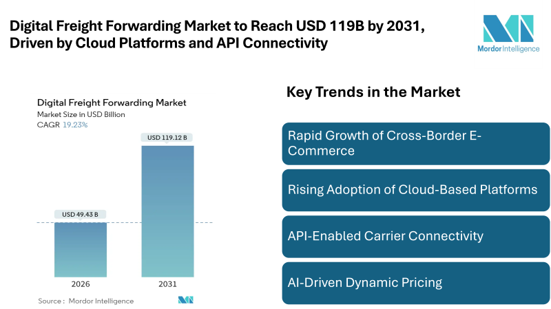 According to Mordor Intelligence the digital freight forwarding market size in 2026 is estimated at USD 49.43 billion, growing from 2025 value of USD 41.46 billion with 2031 projections showing USD 119.12 billion, growing at 19.23% CAGR. This growth is fueled by the increasing adoption of cross-border e-commerce, regulatory mandates for digital trade documentation, and the widespread implementation of cloud-based freight management solutions. The Asia-Pacific region leads the market due to strong manufacturing bases and supportive SME digitization programs, while North America and Europe are expanding through standardized carrier APIs and stringent data accuracy requirements.