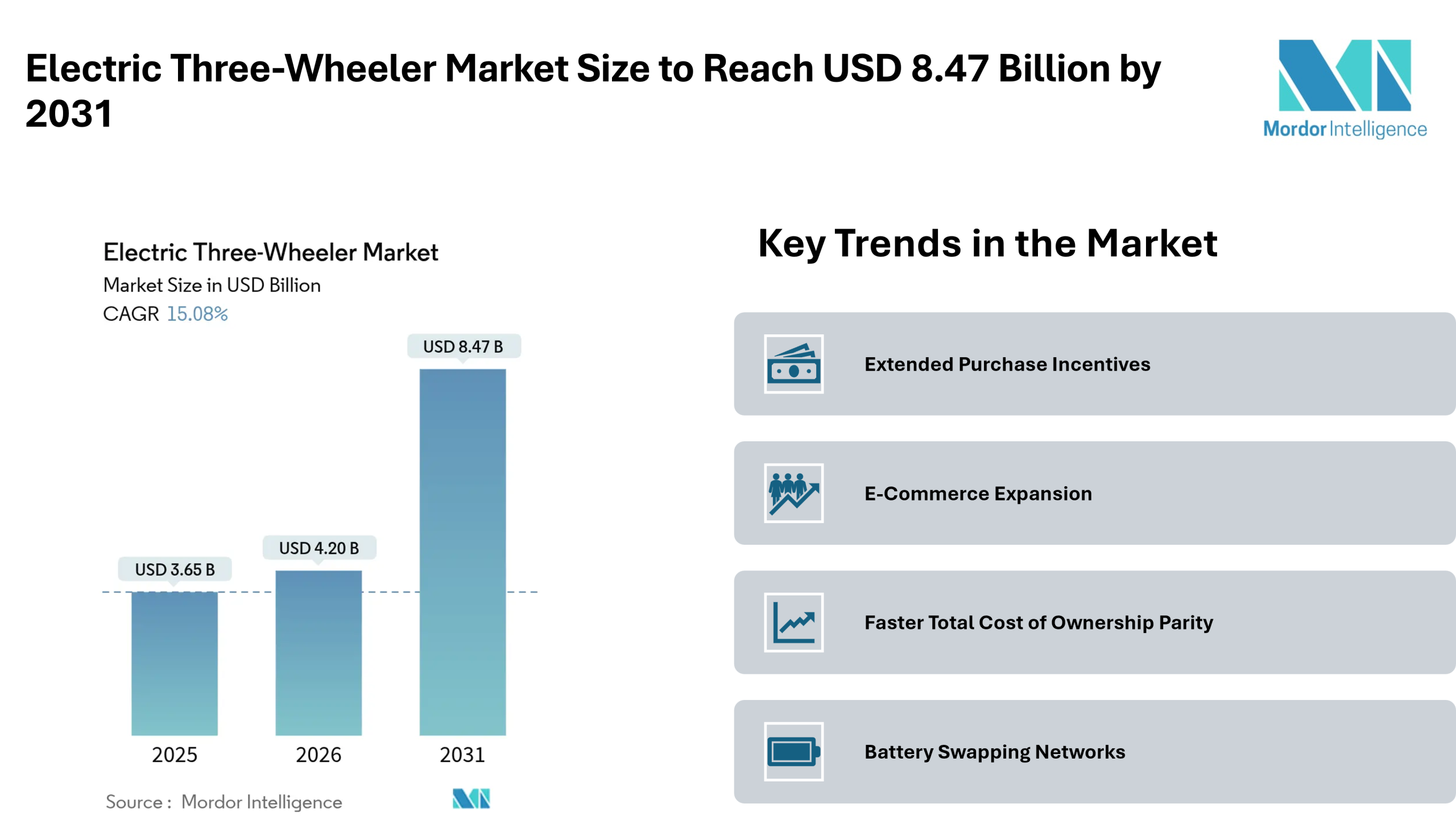 According to Mordor Intelligence, the electric three-wheeler market size was valued at USD 3.65 billion in 2025 and is estimated to grow from USD 4.2 billion in 2026 to reach USD 8.47 billion by 2031, registering a CAGR of 15.08% during the forecast period. The electric three-wheeler market forecast highlights rising demand across passenger and goods carrier applications, supported by policy support, improving battery economics, and expanding charging networks.