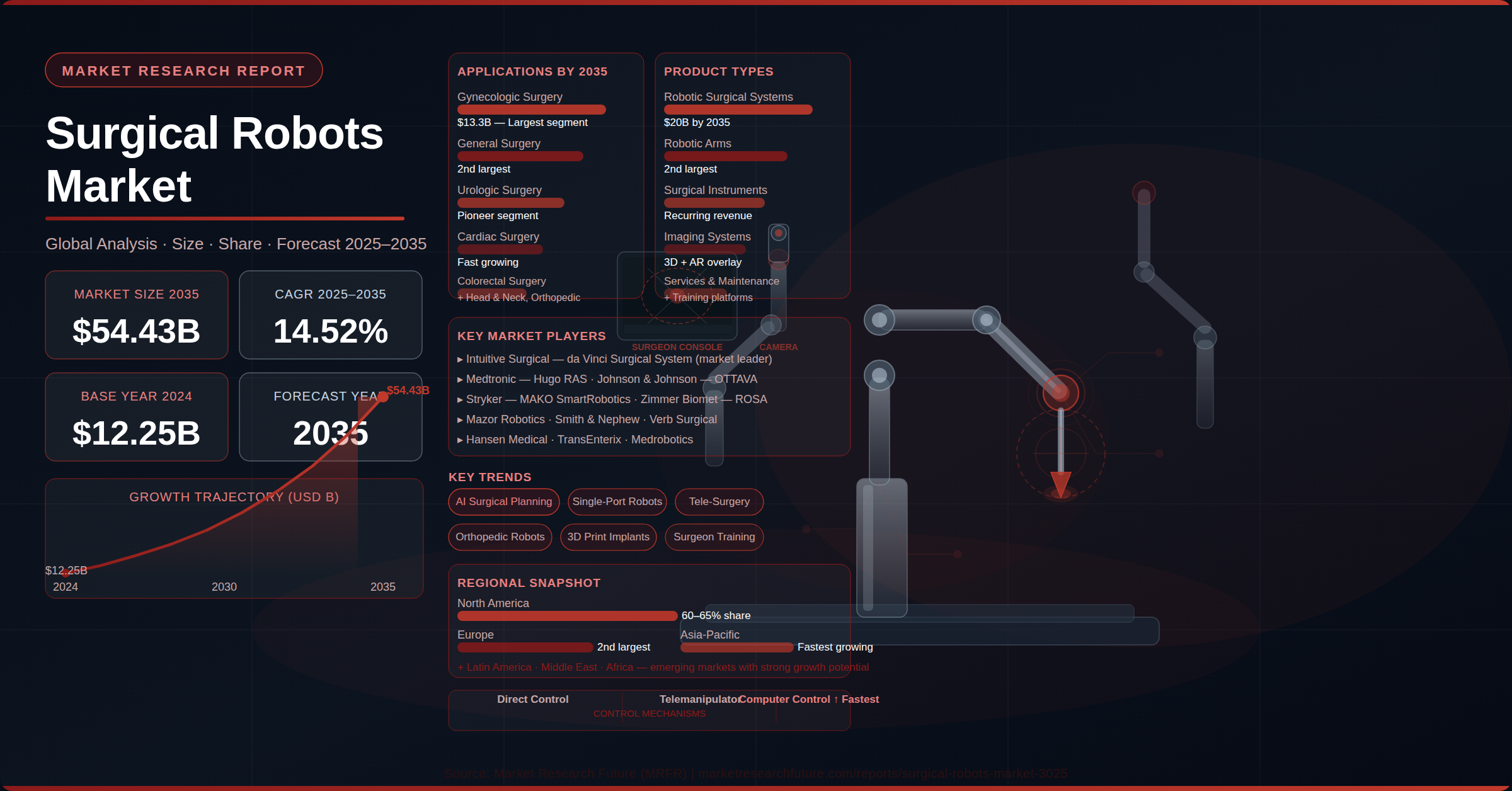 Pune, India — The global Surgical Robots Market is experiencing one of the most dynamic and technology-driven growth trajectories in the entire medical device landscape, according to the latest Surgical Robots Market report published by Market Research Future (MRFR). Valued at USD 12.25 billion in 2024, the market is projected to surge from USD 14.03 billion in 2025 to USD 54.43 billion by 2035, representing a compound annual growth rate (CAGR) of 14.52% during the forecast period 2025 to 2035. This extraordinary expansion — nearly quadrupling market value within a decade — reflects the irreversible global shift toward precision-guided, robotically assisted surgical care that improves clinical outcomes, reduces patient recovery times, and elevates surgical standards across virtually every medical specialty. The Surgical Robots Market growth mirrors the broader Longevity Market size expansion, as aging global populations increasingly require complex surgical interventions — from joint replacements and cardiac procedures to cancer surgeries — that demand the precision and safety advantages uniquely delivered by robotic surgical platforms.