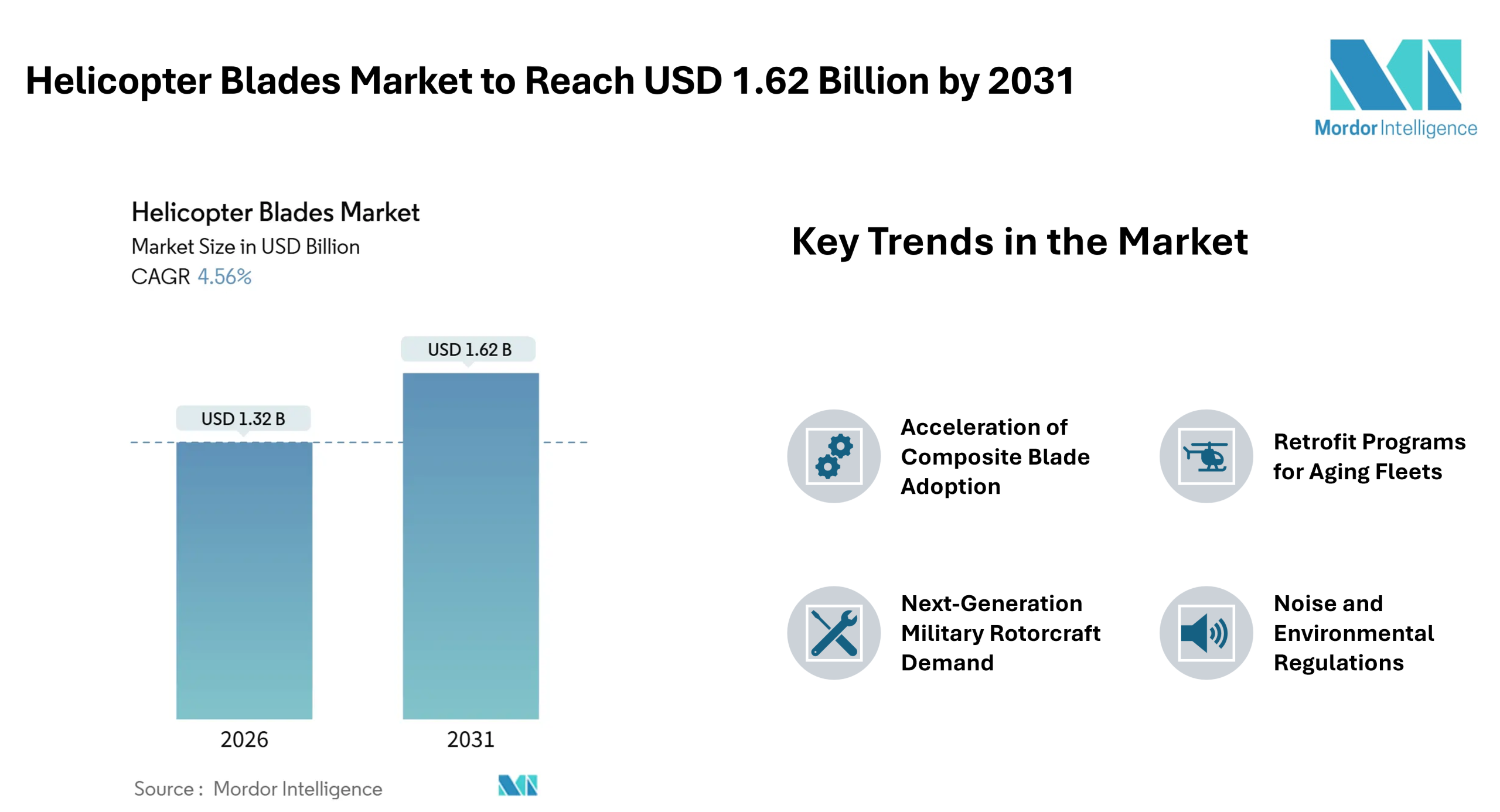 The Helicopter Blades Market size is projected to grow from an estimated USD 1.32 billion in 2026 to USD 1.62 billion by 2031, registering a CAGR of 4.56% during the forecast period. Growth is anchored in the accelerating shift from metal to composite blades, expanding retrofit activity across aging fleets, and next-generation military rotorcraft programs that require enhanced blade performance. Composite materials now account for most of the revenue, while automation in manufacturing is shortening production cycles, enabling suppliers to better meet delivery timelines. Demand is further supported by rising helicopter utilization in civil missions such as offshore crew transport and search-and-rescue operations, which drive higher blade replacement and service activity.