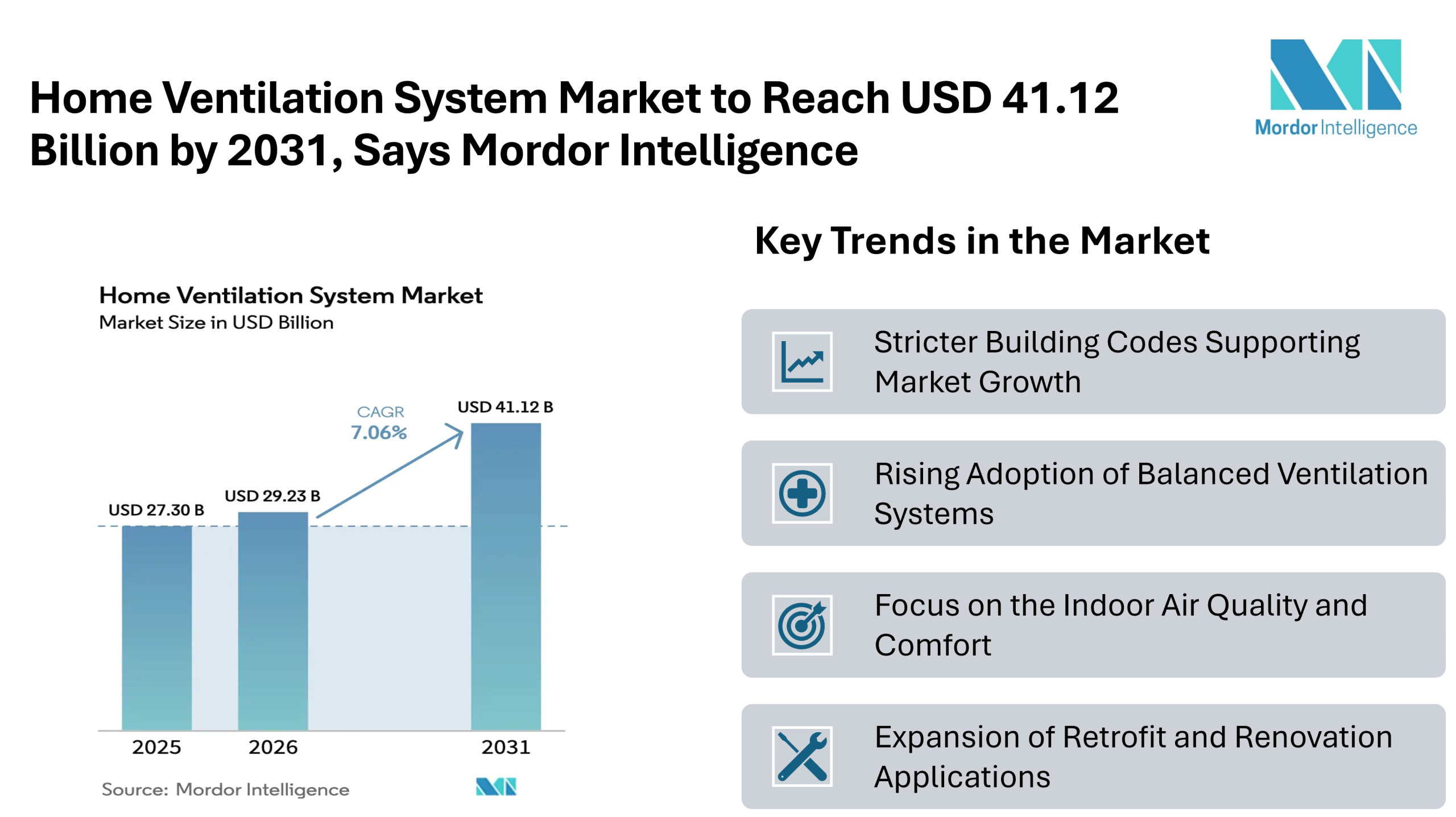 According to Mordor Intelligence, the home ventilation system market size is projected to grow from USD 27.30 billion in 2025 to USD 29.23 billion in 2026 and reach USD 41.12 billion by 2031, growing at a CAGR of 7.06%. This steady market growth reflects rising awareness around indoor air quality, along with stricter building standards that require better airflow management in residential spaces.