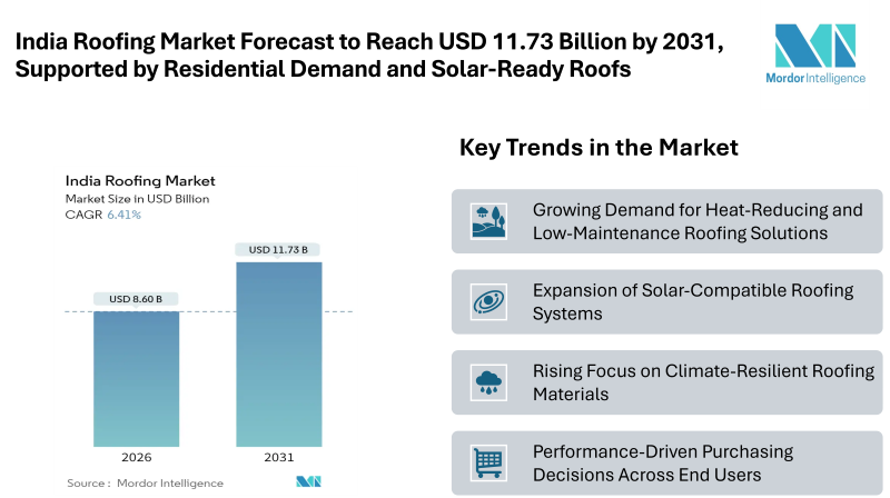 According to Mordor Intelligence, the India Roofing Market Size is valued at USD 8.08 billion in the 2025 and is expected to reach USD 8.6 billion in the following year, with the India Roofing Market Forecast indicating a rise to USD 11.73 billion by 2031. This outlook reflects stable demand fundamentals supported by housing programs, expanding urban centers, and wider awareness of roofing performance in diverse climatic zones.