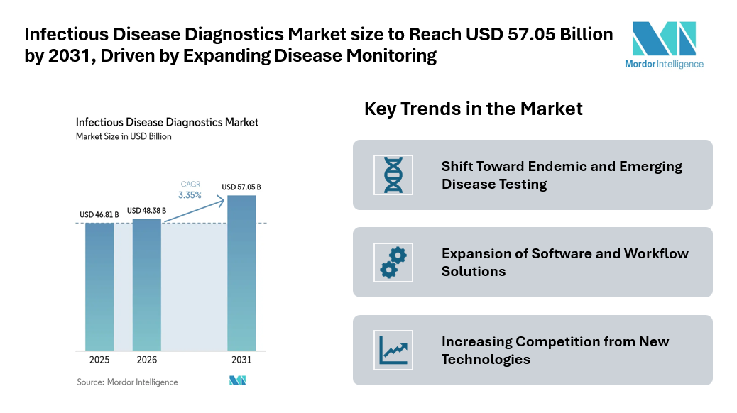 According to Mordor Intelligence, the infectious disease diagnostics market size was valued at USD 46.81 billion in 2025 and is expected to grow from USD 48.38 billion in 2026 to reach USD 57.05 billion by 2031, registering a CAGR of 3.35% during the infectious disease diagnostics market forecast period.
