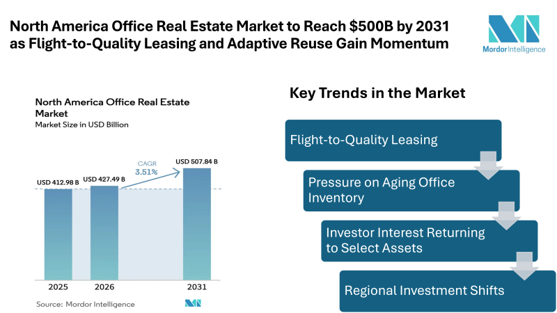 According to Mordor Intelligence, the North America office real estate market size is estimated at USD 427.49 billion in 2026, increasing from USD 412.98 billion in 2025, and projected to reach USD 507.84 billion by 2031, expanding at a CAGR of 3.51% during the forecast period. This outlook reflects both recovery and structural change within the industry, where companies are reassessing workspace strategies while property owners modernize portfolios.