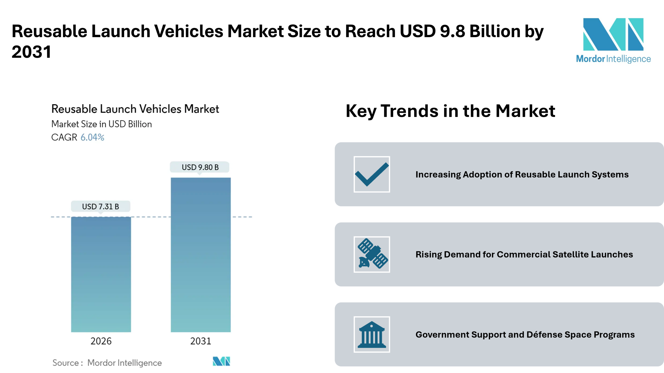 The Reusable Launch Vehicles market is witnessing steady growth as space agencies and commercial launch providers increasingly adopt reusable systems to reduce launch costs and improve mission efficiency. According to Mordor Intelligence, the market was valued at approximately USD 7.31 billion in 2026 and is projected to reach around USD 9.8 billion by 2031, growing at a CAGR of about 6.04% during the forecast period.