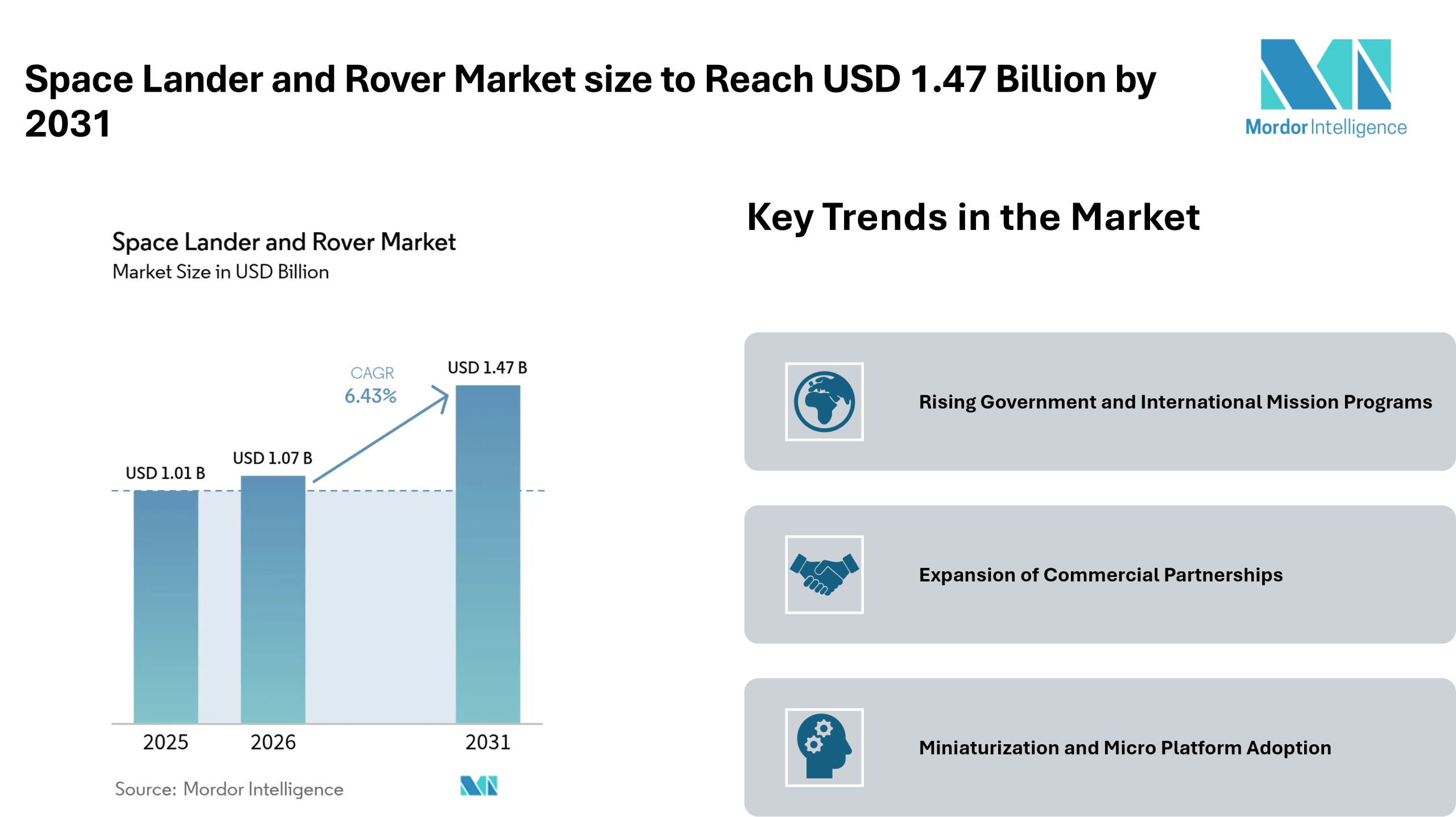 According to Mordor Intelligence, the space lander and rover market size is projected to grow from USD 1.01 billion in 2025 to USD 1.07 billion in 2026, and further reach USD 1.47 billion by 2031, registering a CAGR of 6.43% during the forecast period. This upward trajectory highlights consistent market growth, supported by long-term exploration programs and steady funding pipelines.