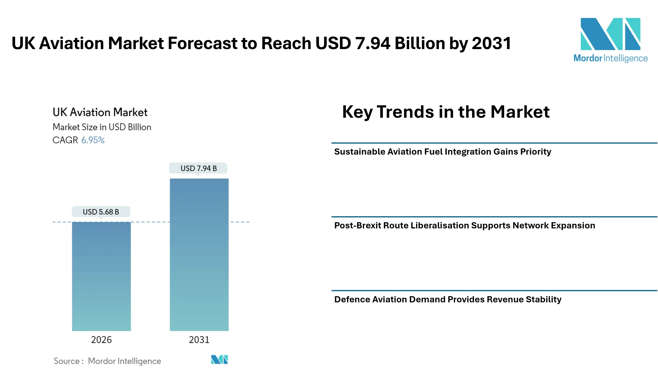 According to Mordor Intelligence, the UK aviation market size was valued at USD 5.68 billion in 2026 to USD 7.94 billion by 2031, reflecting a CAGR of 6.95% during the forecast period. This outlook underlines a balanced recovery supported by civil aviation demand, government defence spending, and policy-driven sustainability goals.