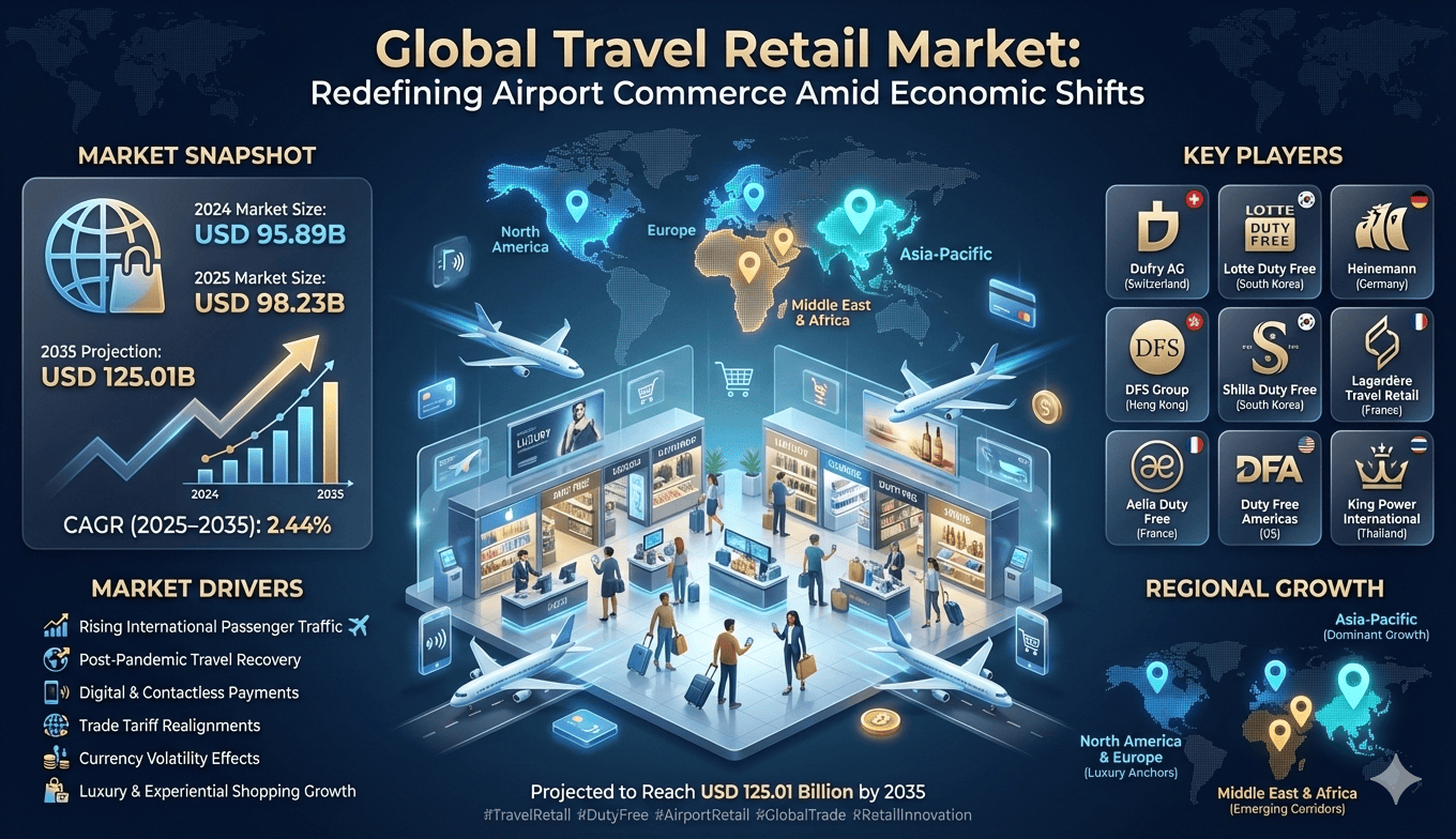 The global defense landscape continues to shape international commerce corridors, and nowhere is this more evident than in the Travel Retail Market, which stands at a critical juncture amid evolving geopolitical complexities. The Travel Retail Market was valued at USD 95.89 billion in 2024 and is projected to reach USD 98.23 billion in 2025, demonstrating resilience despite mounting global challenges. By 2035, the market is expected to expand to USD 125.01 billion, growing at a compound annual growth rate (CAGR) of 2.44% during the forecast period from 2025 to 2035. This sector encompasses duty-free shops, airport retail outlets, cruise ship stores, and border retail operations that cater to international travelers seeking premium products at tax-advantaged prices.